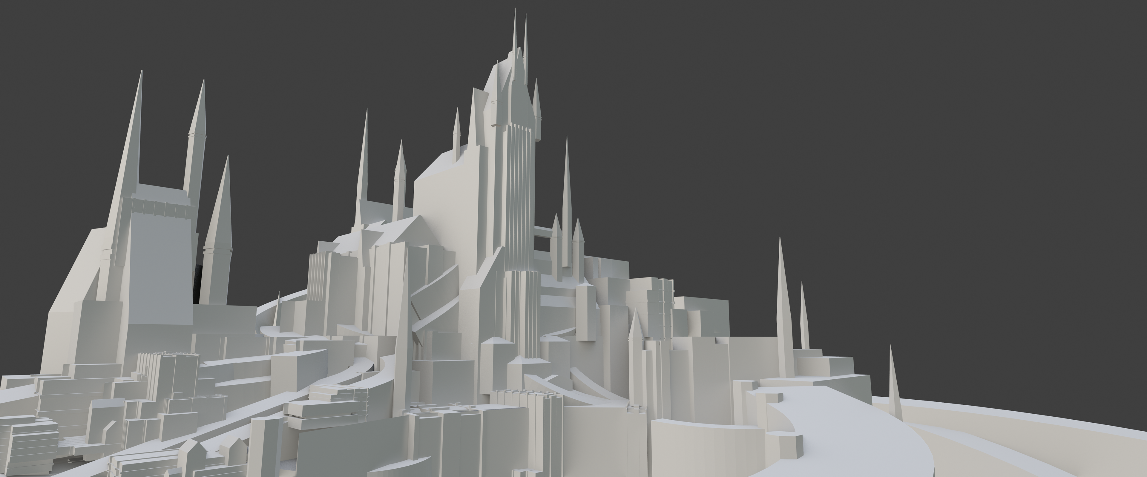 I started out by blocked out most of the city according to my thumbnail, starting with really simple shapes, getting the camera in the right position and seeing if the building proportions feel good.